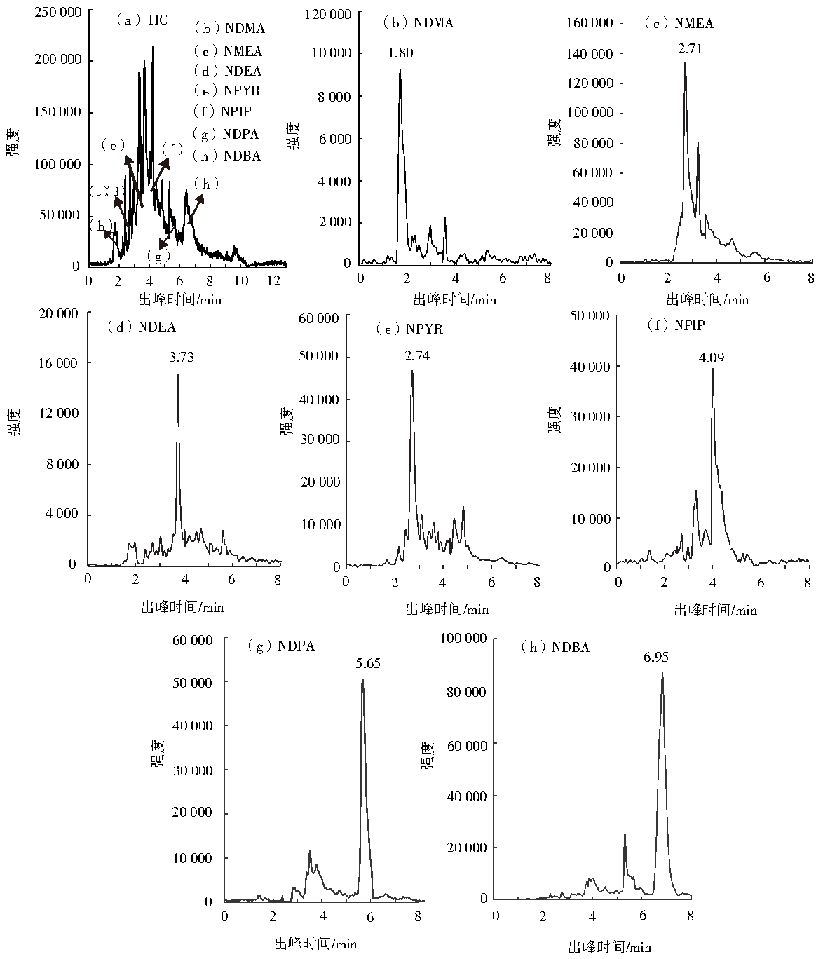 7種亞硝胺類物質(zhì)的剖析選用Waters(美國)出產(chǎn)的UPLC-TQD型超高效液相色譜質(zhì)譜聯(lián)用儀。色譜柱為 HALO 2 C18 (2.1 mm×100 mm,2 µm),挑選甲醇為有機(jī)相,10 mmol·L−1(pH為8.0左右)的碳酸氫銨為無機(jī)相,活動相流速為0.2 mL·min−1,進(jìn)樣體積為10 µL,柱溫文樣品室溫度分別為40 ℃和25 ℃。選用梯度洗脫的辦法對所測物質(zhì)進(jìn)行別離,活動相梯度改動為:0.2→3.00 min,5%→40%(甲醇);3.00→6.00,40%→60%(甲醇);6.00→8.50 min,60%→100%(甲醇);8.50→11.00 min,100%→5%(甲醇);5%的甲醇堅持2 min,總運轉(zhuǎn)時刻為13 min。運轉(zhuǎn)儀器進(jìn)行測守時選用MRM(多通道監(jiān)測)形式,得到TIC(總離子流圖)和7種亞硝胺類物質(zhì)的色譜提取圖。