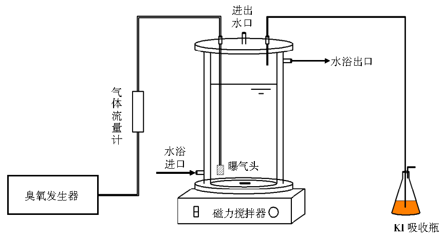 臭氧氧化試驗設(shè)備如圖1所示。該設(shè)備主體反響器有用體積為4.5 L,臭氧發(fā)生器(廣州佳環(huán)電器科技有限公司,HY-006-2CA)出口流量通過氣體流量計調(diào)理操控在60 L·h−1,未反響的氣體通入20% KI溶液進(jìn)行吸收。整個反響設(shè)備通過水浴調(diào)理使得反響溫度操控在20 ℃,該臭氧氧化體系通過調(diào)理不同的反響時刻來操控臭氧投加量,整個反響進(jìn)程在通風(fēng)櫥內(nèi)進(jìn)行。