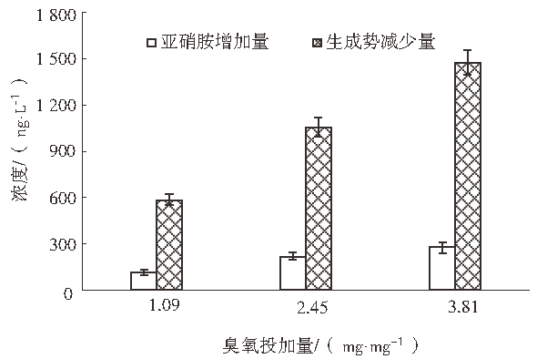 生成勢的測定是在臭氧氧化試驗的基礎(chǔ)上,參加用氯化銨和次氯酸鈉(以Cl2計)按摩爾比1.2∶1配制氯胺溶液,在恒溫(25 ℃)漆黑中貯存10 d,再測定亞硝胺的總量,反響前后物質(zhì)的濃度差值即為該物質(zhì)的生成勢。
